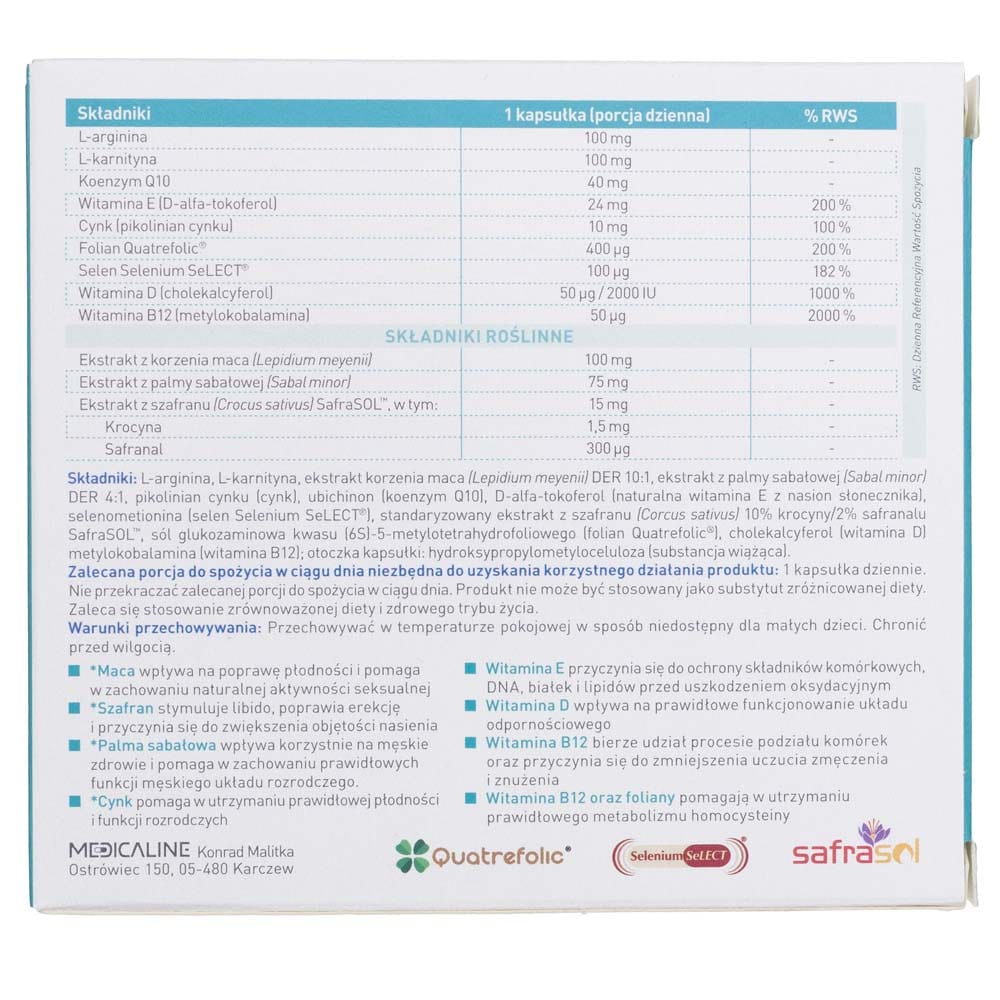 L-Arginin, L-Carnitin, Maca-Wurzel-Extrakt (Lepidium meyenii) DER 10: 1, Extrakt aus Sägepalme (Sabal minor) DER 4: 1, Zinkpicolinat (Zink), Ubichinon (Coenzym Q10), D-alpha-Tocopherol (natürliches Vitamin E aus Sonnenblumenkernen), Selenomethionin (Selenium SeLECT® Selen), SafraSOL ™ standardisierter Safranextrakt (Crocus sativus, 10% Crocin / 2% Safranal), Salz (6S) -5-Methyltetrahydrofolsäure Glucosamin (Quatrefolic® Folat), Cholecalciferol (Vitamin D) Methylcobalamin (Vitamin B12); Kapselhülle: Hydroxypropylmethylcellulose (Bindemittel).