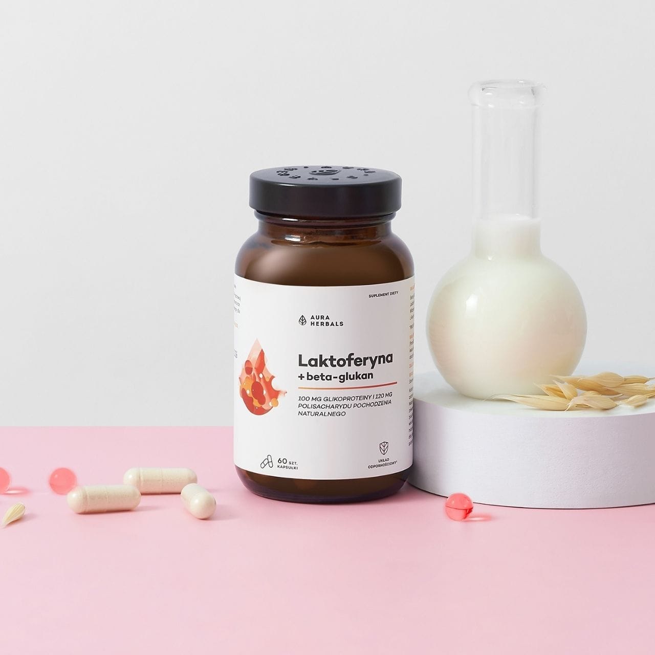 Aura Herbals Lactoferrin + Beta-Glucan ist ein Nahrungsergänzungsmittel in vegetarischen Kapseln mit PromOat® Beta-Glucan aus Hafer (120 mg) , Lactoferrin aus Milch (100 mg) und Vitamin C (40 mg = 50 % der empfohlenen Tagesdosis) . Vitamin C trägt zu einer normalen Funktion des Immunsystems bei. Das Produkt entspricht dem Clean-Label- Konzept – ohne künstliche Farb- und Konservierungsstoffe. HPMC-Kapsel. Packung mit 60 Kapseln = 60 Tage . Enthält Milch und Hafer.