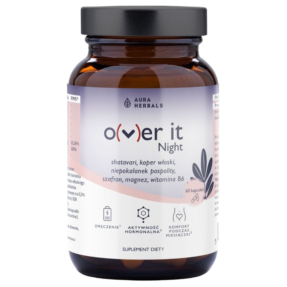 Aura Herbals Over It Night ist ein Nahrungsergänzungsmittel in Kapselform. Es enthält Pflanzenextrakte aus Mönchspfeffer, Safran, Shatavari und Fenchel. Die Zusammensetzung ist mit Magnesium und Vitamin B6 (Quali®-B) angereichert.