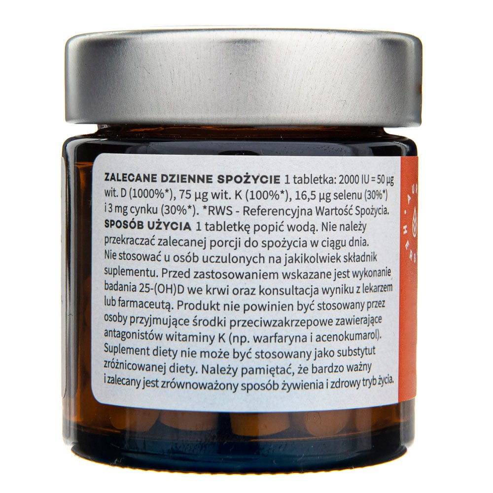 Nahrungsergänzungsmittel in Tablettenform von Aura Herbals mit Vitamin D3 in einer Dosis von 2000 IU, Vitamin K2mk7, Selen in Form von natürlicher Selenhefe und Zink. Für seine Herstellung haben wir zertifiziertes Vitamin D - Quali®-D - verwendet. Dabei handelt es sich um das hochwertigste Vitamin D, das aus Lanolin, der Wolle von lebenden und gesunden Schafen, die auf australischen und neuseeländischen Weiden leben, gewonnen wird. Dank der fein dispergierten Partikel, die in spezialisierten Schweizer Labors gewonnen werden, zeichnet sich Quali®-D durch eine sehr stabile Form aus. Dank dieses innovativen Verfahrens enthält Aura Herbals Vitamin D natürlichen Ursprungs, das noch schneller und leichter vom menschlichen Körper aufgenommen wird.