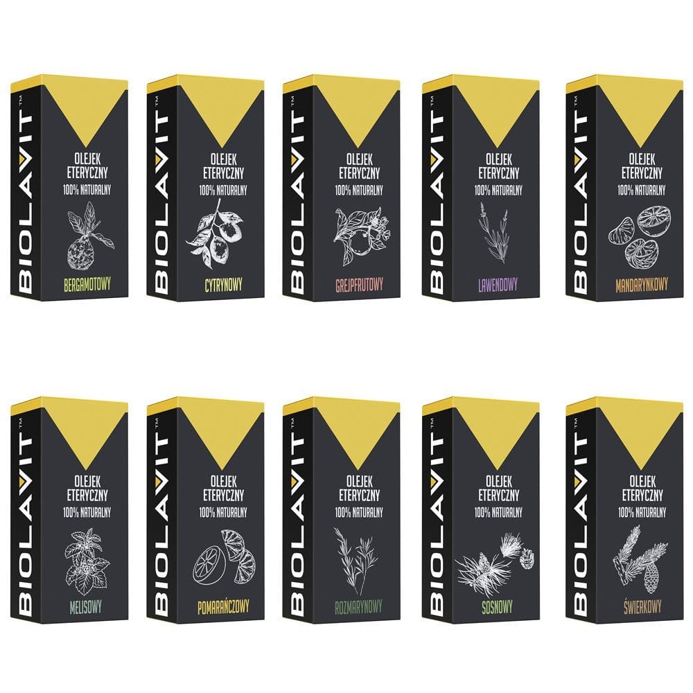 Set mit 10 ätherischen Ölen von Bilovit. Das Set enthält Bergamotte-, Zitronen-, Grapefruit-, Lavendel-, Mandarinen-, Zitronenmelissen-, Orangen-, Rosmarin-, Fichten- und Kiefernöl.