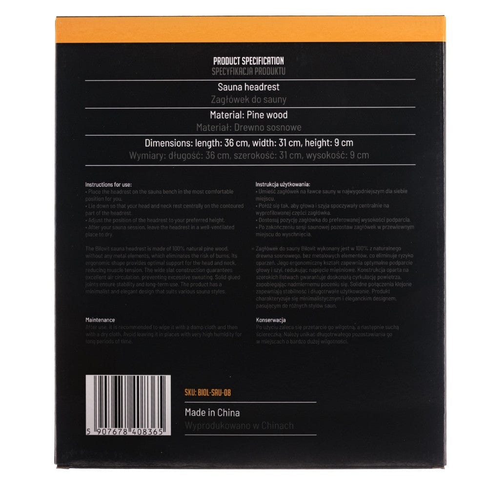 Die Kopfstütze besteht aus Naturholz und ist dadurch beständig gegen hohe Temperaturen. Die Sauna-Rückenlehne ist vollständig verklebt – sie enthält keine Metallteile, wodurch die Gefahr von Verbrennungen ausgeschlossen ist.