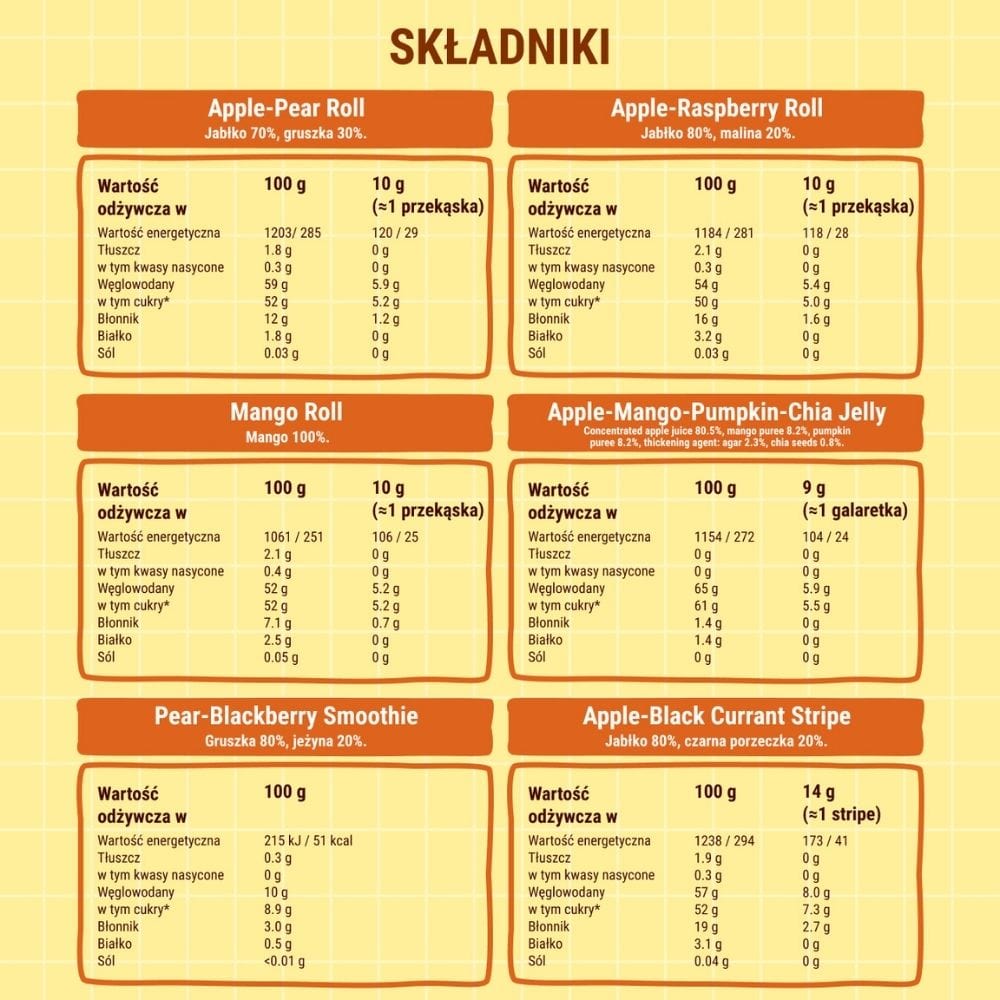 - Apfel-Mango-Kürbis-Chia-Gelee (Zutaten: 80,5 % konzentrierter Apfelsaft, 8,2 % Mangopüree, 8,2 % Kürbispüree, Verdickungsmittel: 2,3 % Agar-Agar, 0,8 % Chiasamen).
