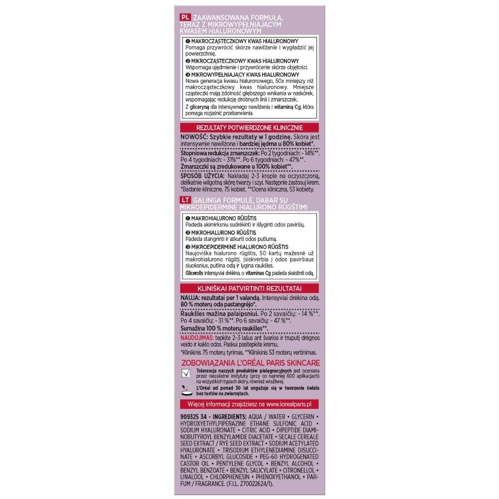L'Oréal Paris Revitalift Filler Serum ist ein konzentriertes Gesichtsserum mit drei Hyaluronsäuretypen. Das Produkt spendet der Haut intensive Feuchtigkeit, glättet Fältchen und verbessert die Festigkeit bereits 1 Stunde nach der Anwendung. Geeignet für alle Hauttypen, auch für empfindliche Haut.