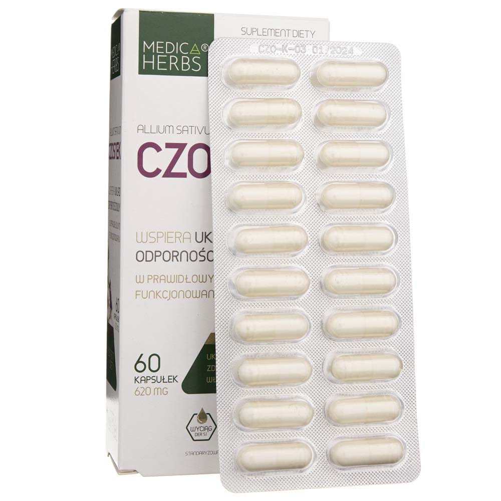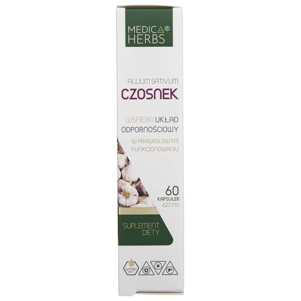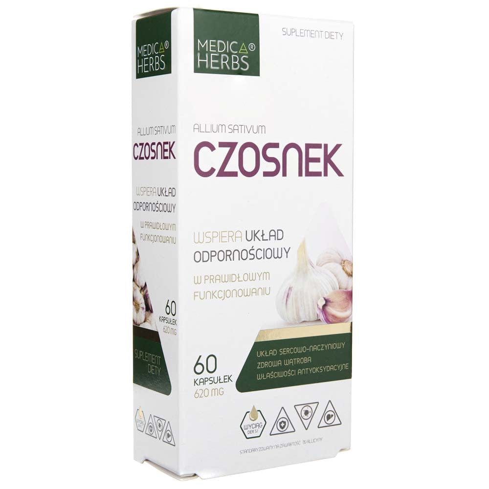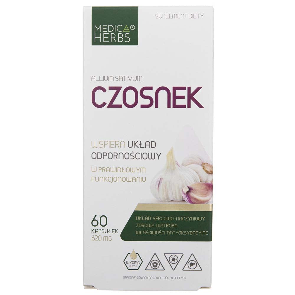 Knoblauch von Medica Herbs ist ein Nahrungsergänzungsmittel in Kapseln, das den Extrakt der Knoblauchzwiebel Allium sativum enthält.