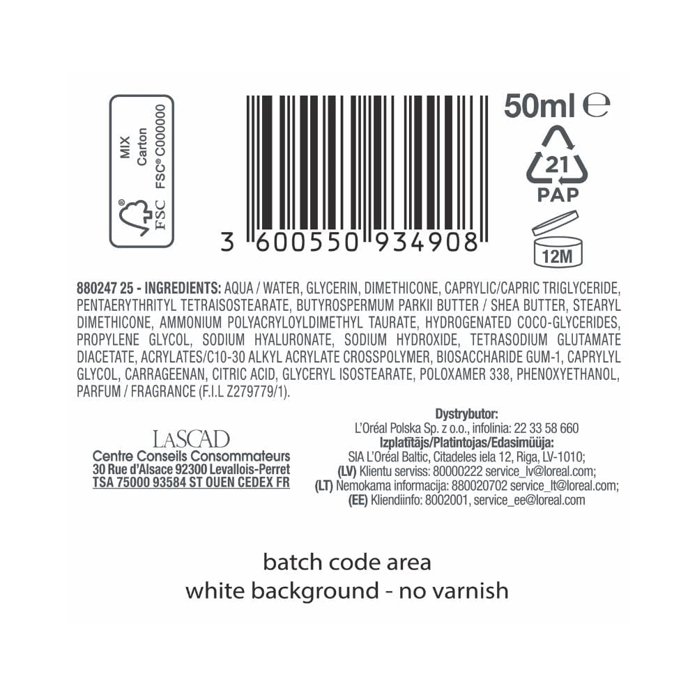 Aqua / Wasser • Glycerin • Dimethicon • Capryl-/Caprintriglycerid • Pentaerythrityltetraisostearat • Butyrospermum Parkii Butter / Sheabutter • Stearyldimethicon • Ammoniumpolyacryloyldimethyltaurat • Hydrierte Coco-Glyceride • Propylenglykol • Natriumhyaluronat • Natriumhydroxid • Tetranatriumglutamatdiacetat • Acrylate/C10-30-Alkylacrylat-Crosspolymer • Biosaccharidgummi-1 • Caprylylglykol • Carrageen • Zitronensäure • Glycerylisostearat • Poloxamer 338 • Phenoxyethanol • Parfüm / Duftstoff