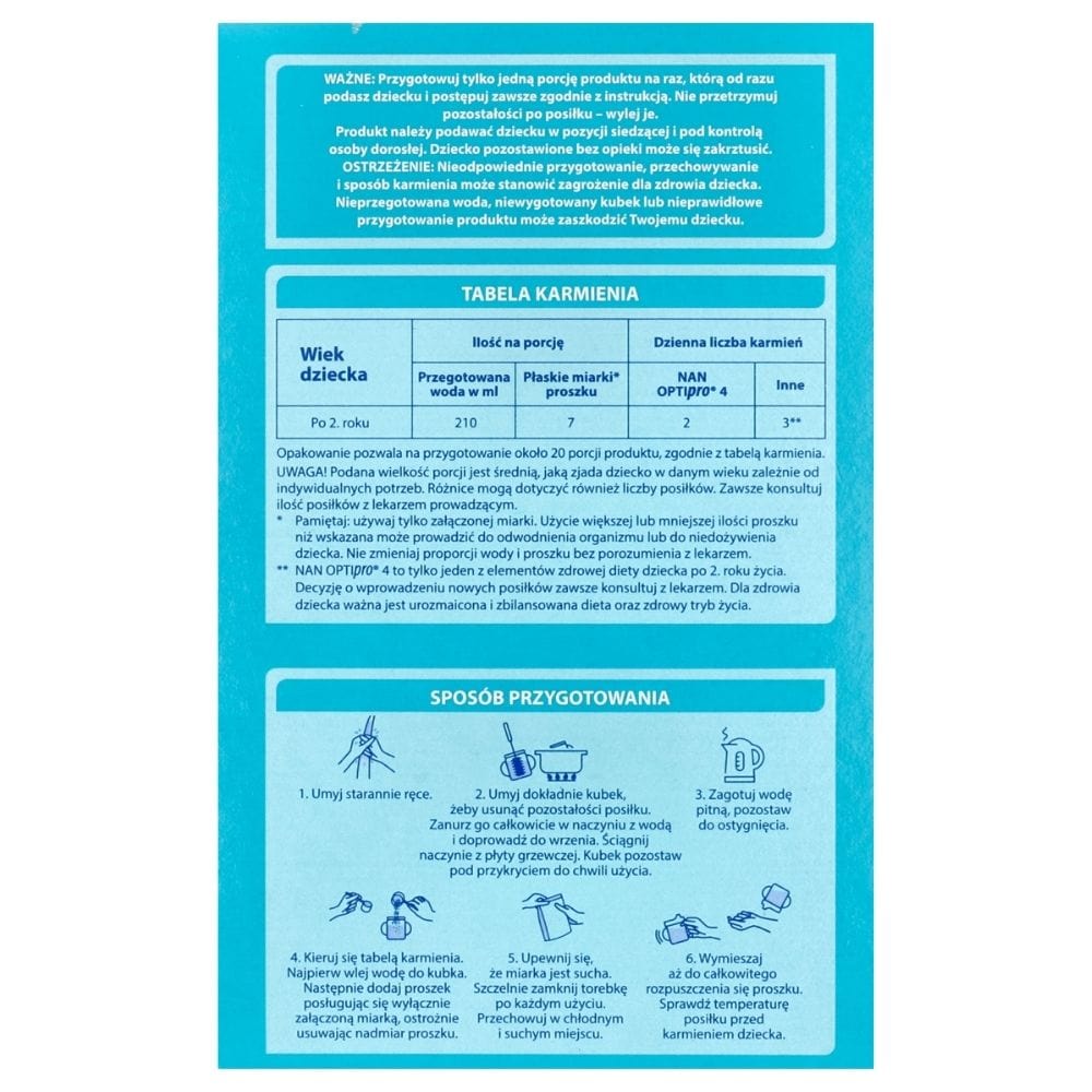 Nestlé NAN OPTIpro 4 ist ein Milchprodukt für Kleinkinder ab 2 Jahren. Angereichert mit Vitaminen und Mineralstoffen. Es ist kein Ersatz für Muttermilch, sondern ein Produkt, das die richtige Zusammenstellung der Ernährung eines Kindes erleichtert.