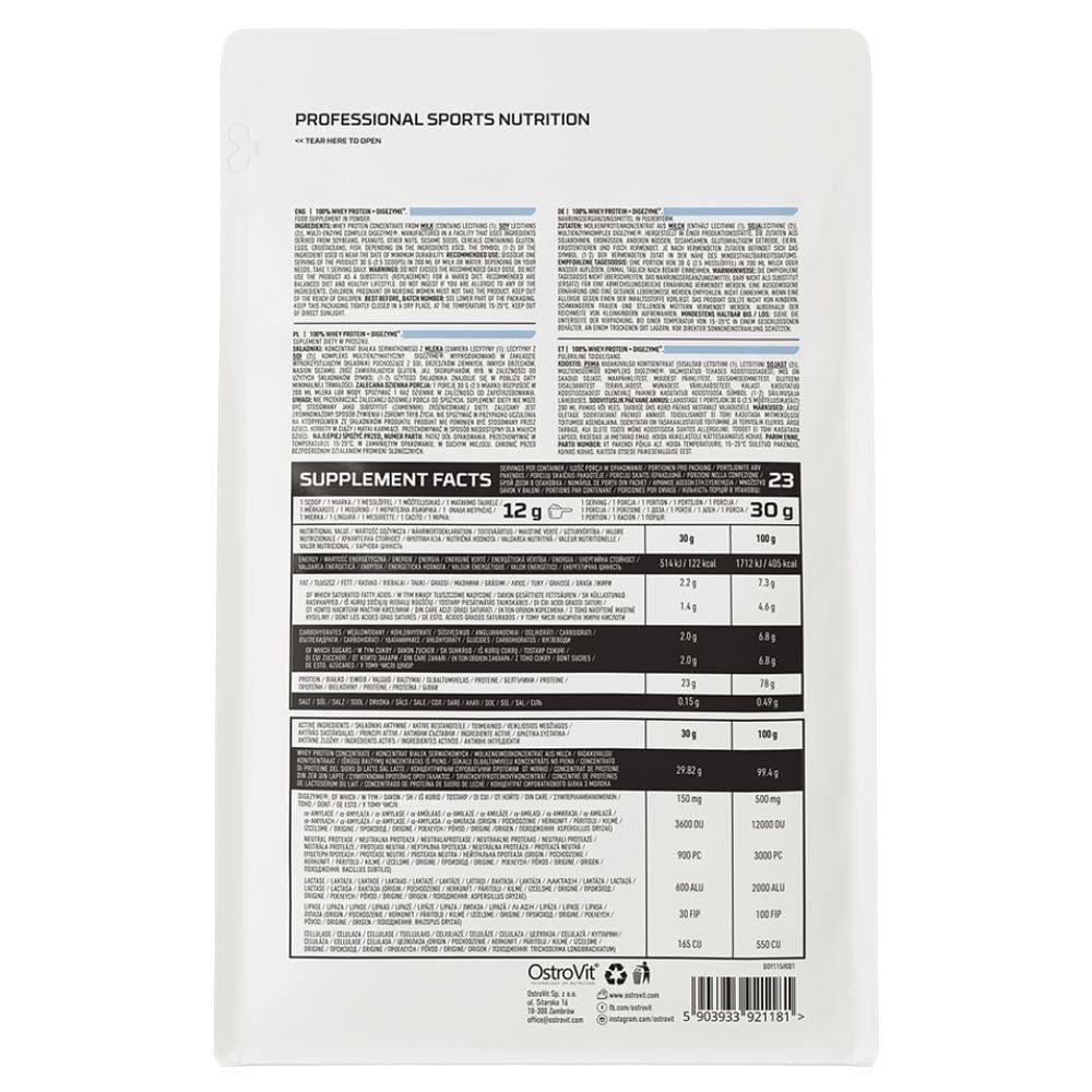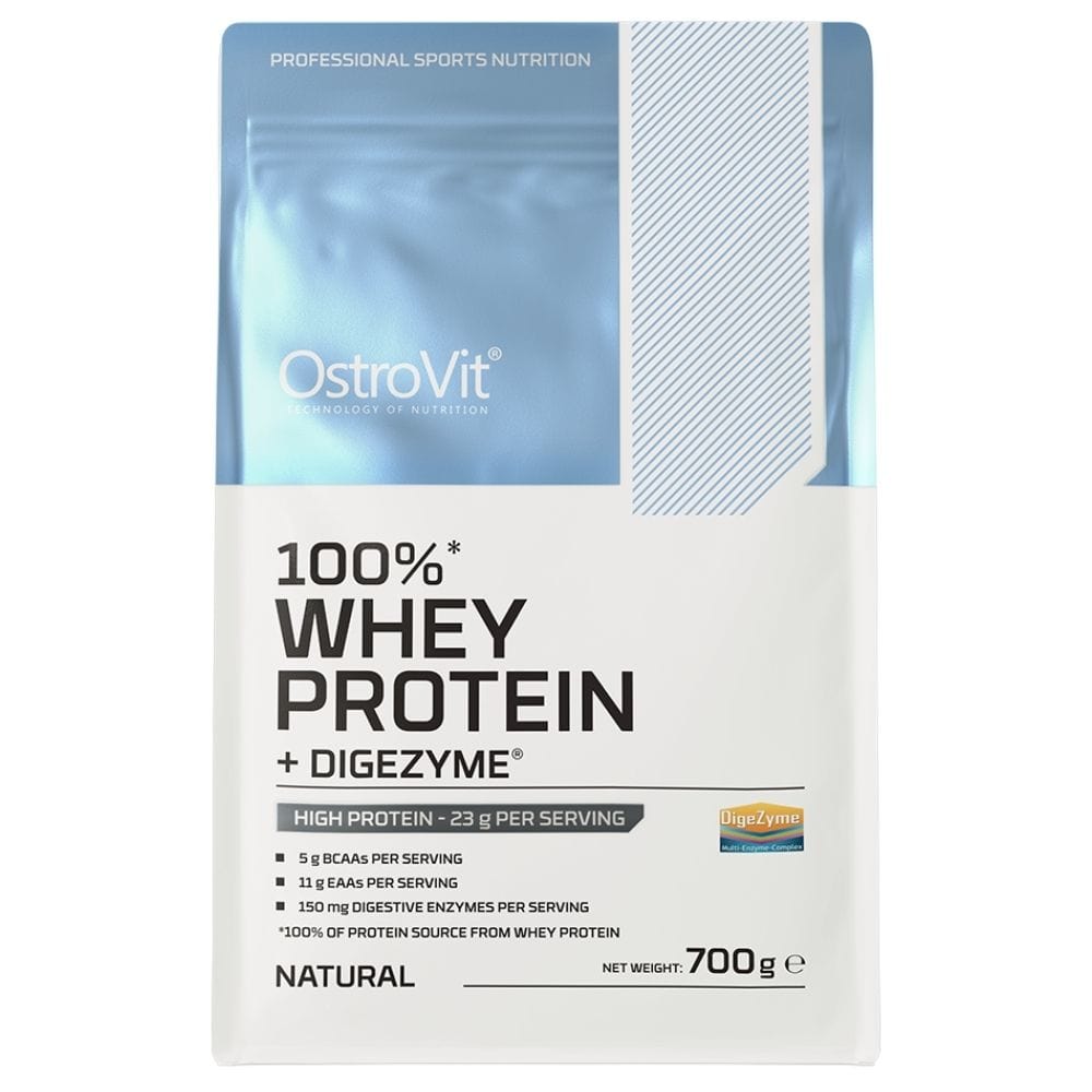OstroVit 100% Whey Protein + Digezyme® ist ein flüssiges Nahrungsergänzungsmittel. Quelle für Molkenproteinkonzentrat mit Zusatz des multienzymatischen Komplexes DigeZyme®. Reich an BCAAs und EAAs. Ohne unnötige Zusatzstoffe, mit natürlichem Geschmack.