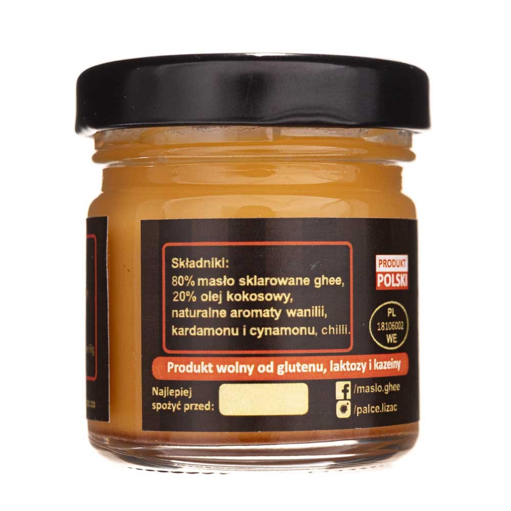 80 % geklärte Ghee-Butter, 20 % Kokosöl, natürliche Aromen von Vanille, Kardamom und Zimt, Chili.