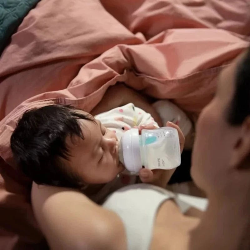 - Halten Sie die Flasche während des Fütterns, aufrecht, damit die AirFree-Entlüftung richtig funktioniert und der Sauger mit Milch gefüllt bleibt.