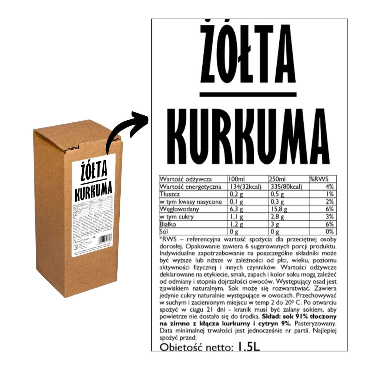 Die Zutaten bestehen ausschließlich aus Kurkuma-Rhizomsaft (91 %) und Zitronensaft (9 %) – ohne Konservierungs-, Aroma- oder Farbstoffe. Die Pasteurisierung bei 80 °C gewährleistet eine lange Haltbarkeit und bewahrt gleichzeitig den natürlichen Charakter des Produkts. Die Bag-in-Box-Verpackung mit Verschluss schützt den Inhalt vor Luftkontakt.